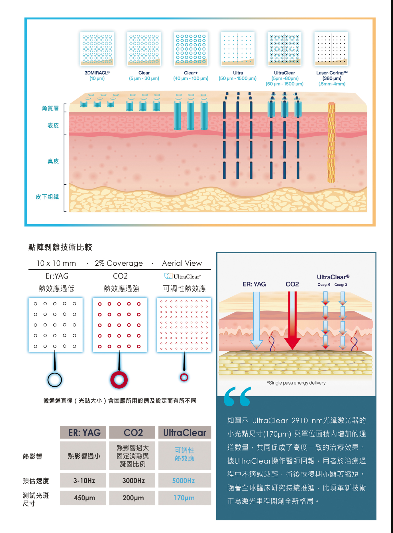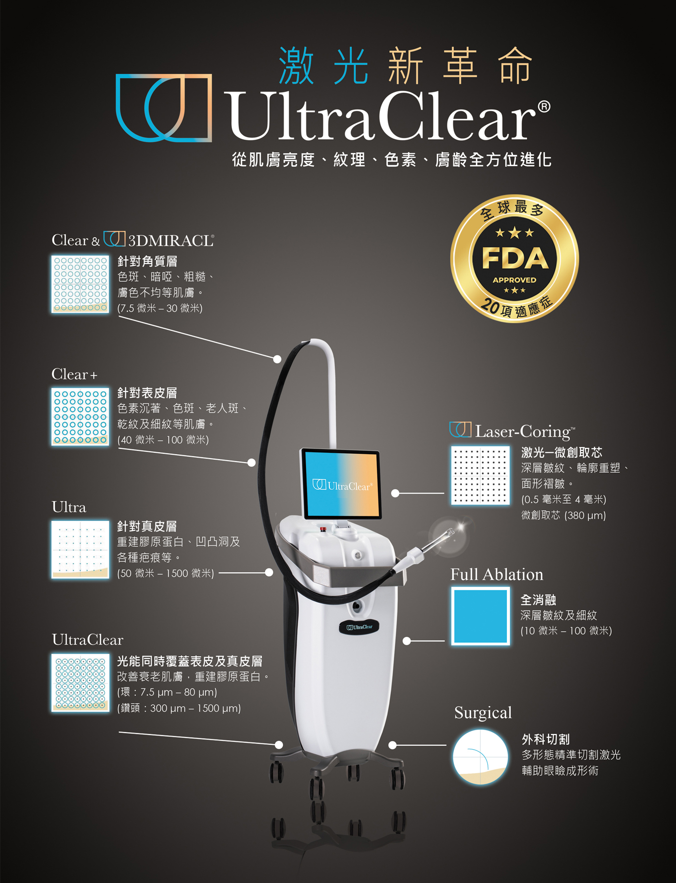 UltraClear® 冷纖激光(Cold Ablative Fiber Laser) 由美國羅德島頂尖技術研發,為全球目前最新使用波長 2910nm 的 all in one抗衰老儀器,擁有20項FDA臨床認證,證實可改善20多項適應症。治療深度可從肌膚角質層至皮下4mm,具有170µm的極小光點,能大幅減少皮膚熱傷害、極低痛感,超短修復期。