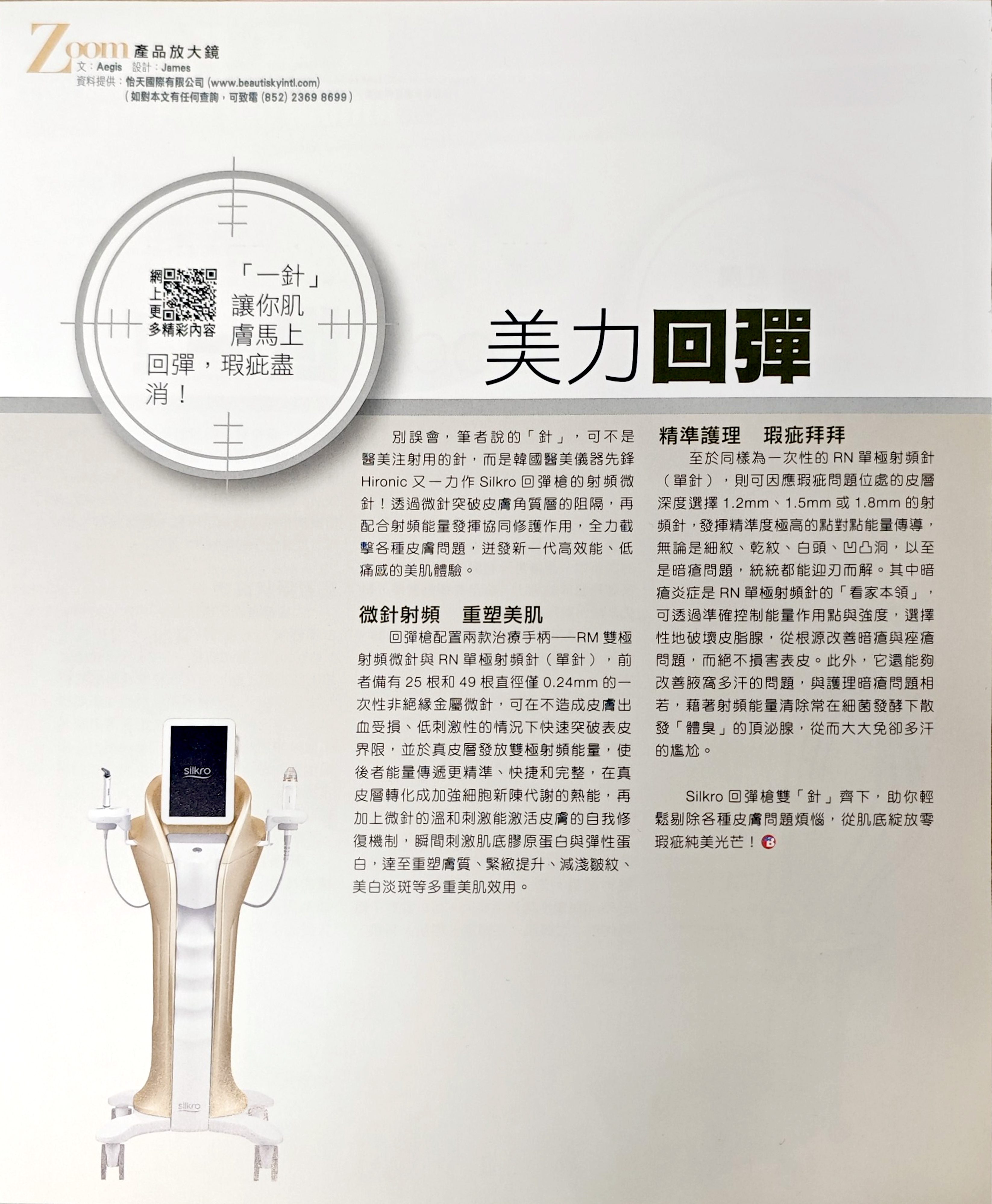 別誤會,筆者說的「針」,可不是醫美注射用的針,而是韓國醫美儀器先鋒Hironic又一力作Silkro回彈槍的射頻微針!透過微針突破皮膚角質層的阻隔,再配合射頻能量發揮協同修護作用,全力截擊各種皮膚問題,迸發新一代高效能、低痛感的美肌體驗。